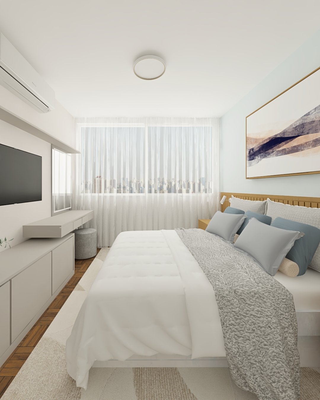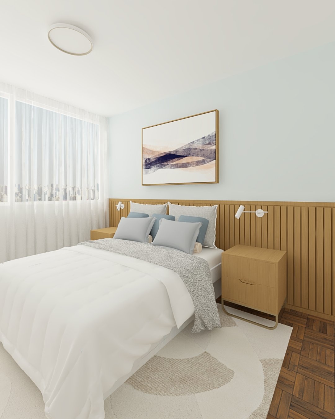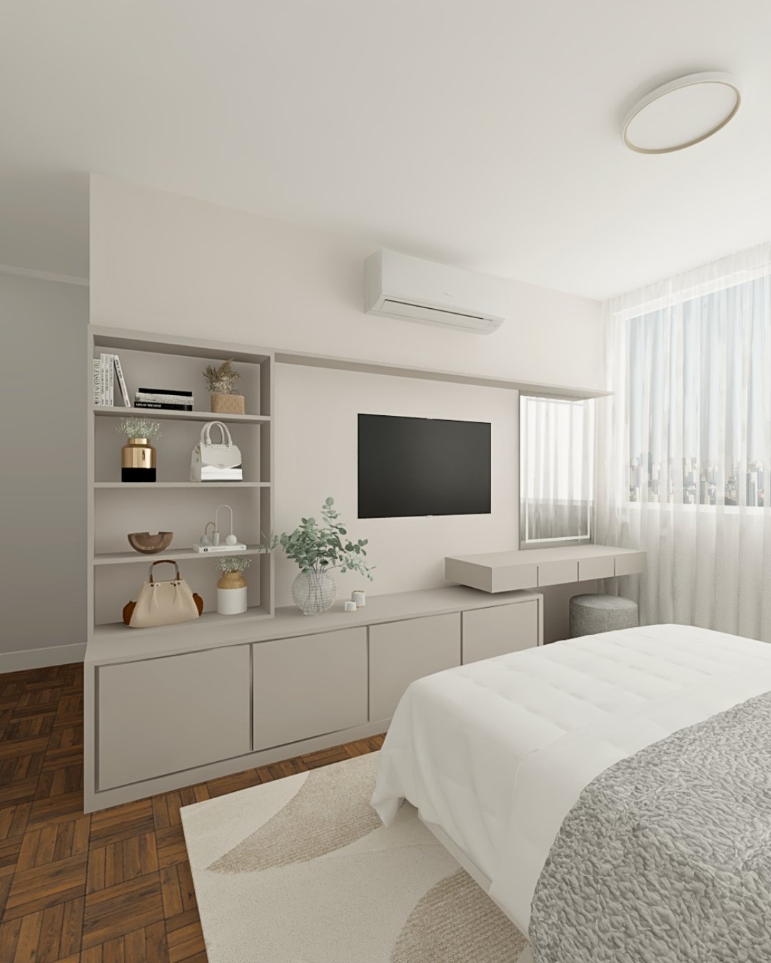 A proposta foi criar ambientes leves e acolhedores, com identidade própria, a partir de uma base neutra e atemporal. A intenção era que cada espaço tivesse personalidade, sem excessos.