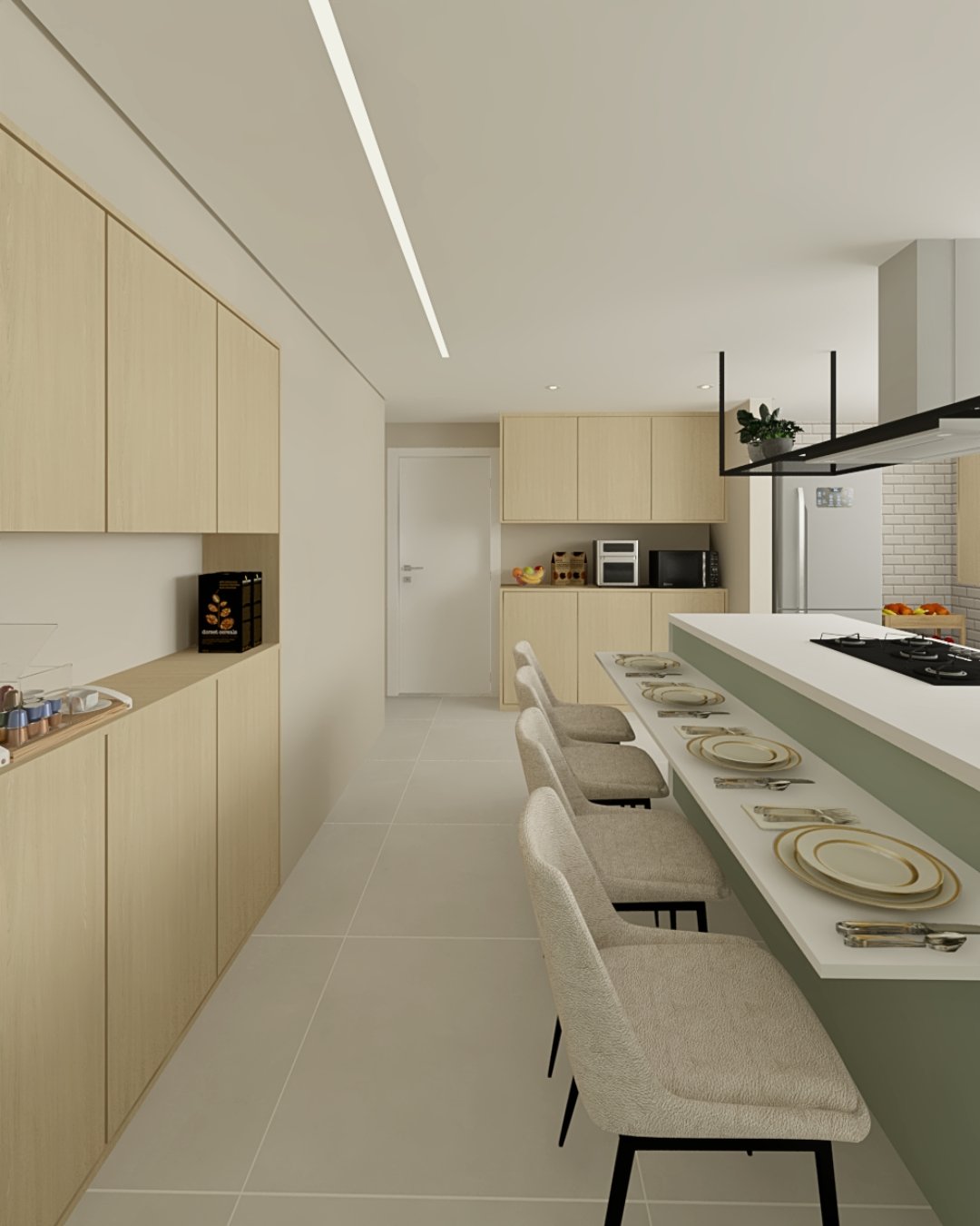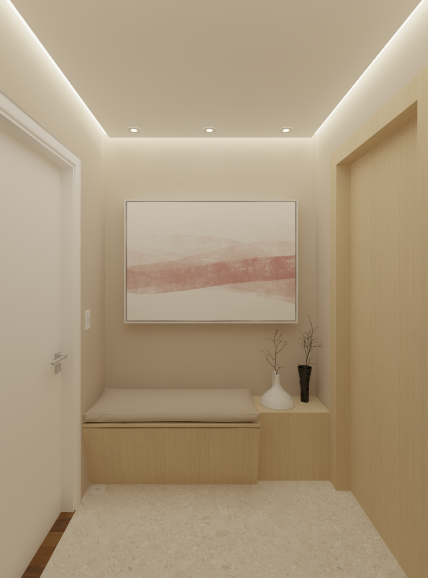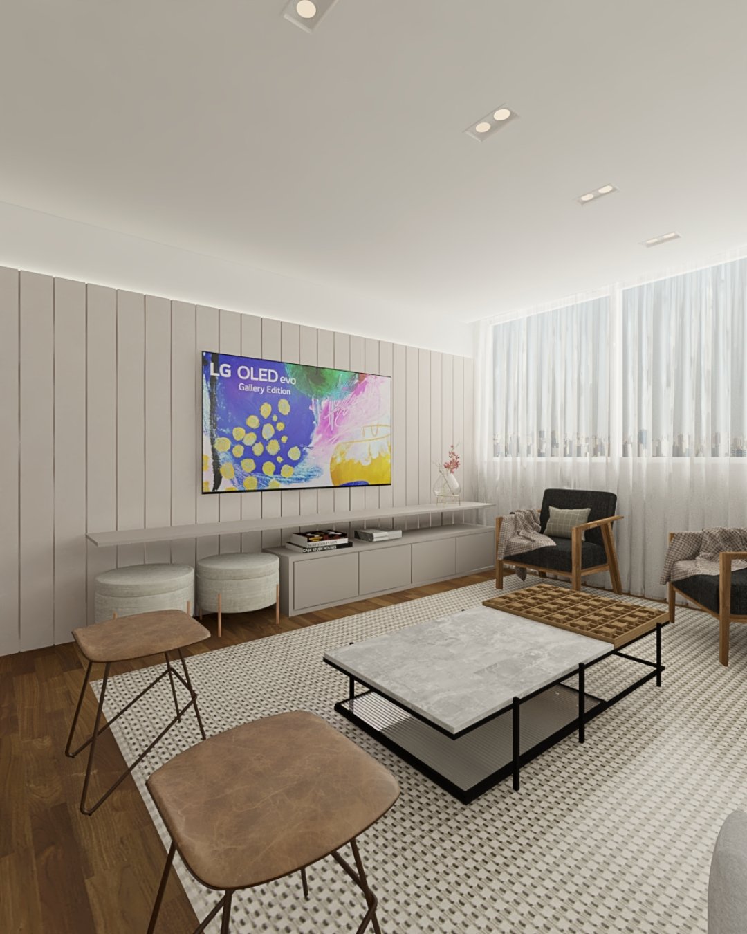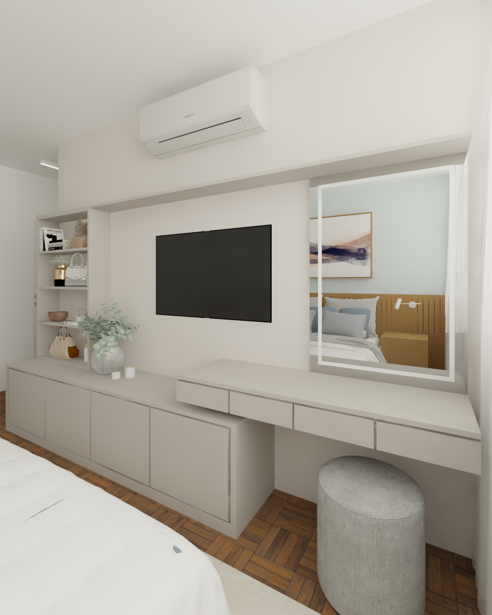 A proposta foi criar ambientes leves e acolhedores, com identidade própria, a partir de uma base neutra e atemporal. A intenção era que cada espaço tivesse personalidade, sem excessos.