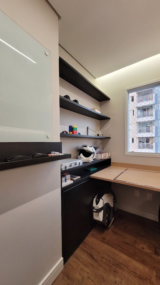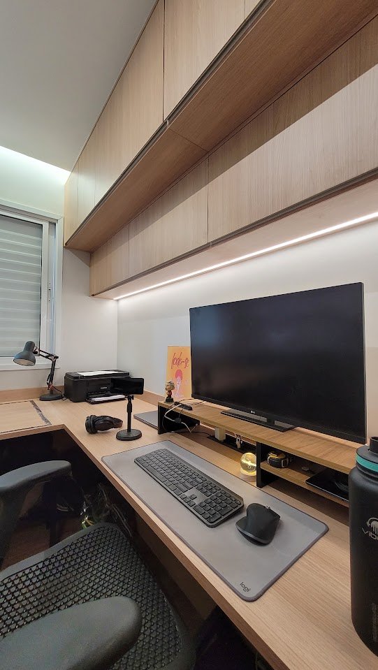 Do lado oposto, a marcenaria planejada garante amplo espaço de armazenamento, além de uma bancada de trabalho bem iluminada, tornando o ambiente organizado, funcional e adaptável às diferentes atividades do cotidiano.