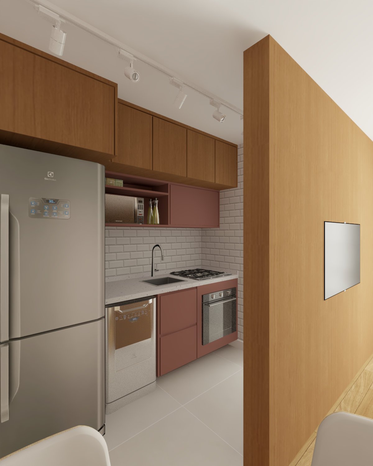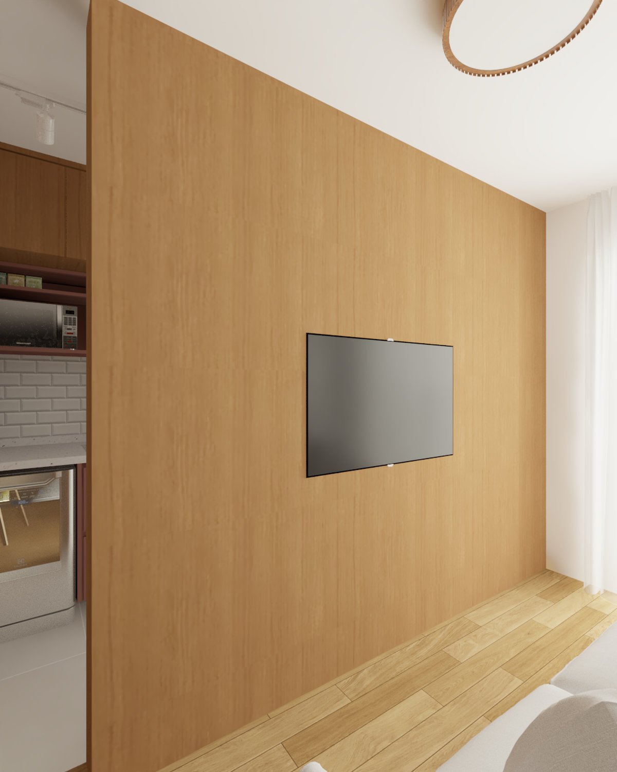 O projeto desse studio de 50m² foi pensado para uma cliente que tinha o desejo de incorporar no apartamento uma referência sutil à Taylor Swift, especialmente uma instalação realizada para a divulgação de um de seus álbuns.