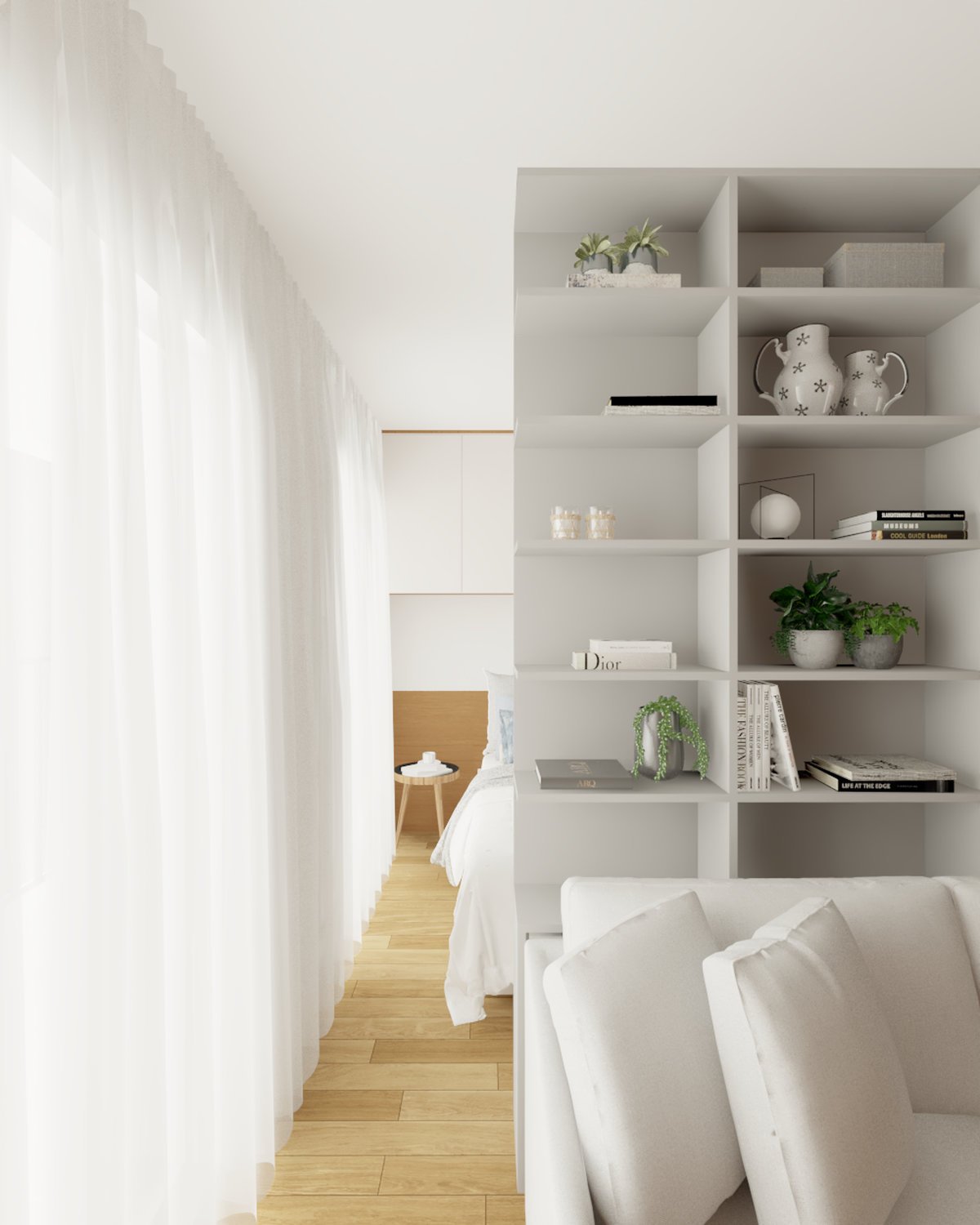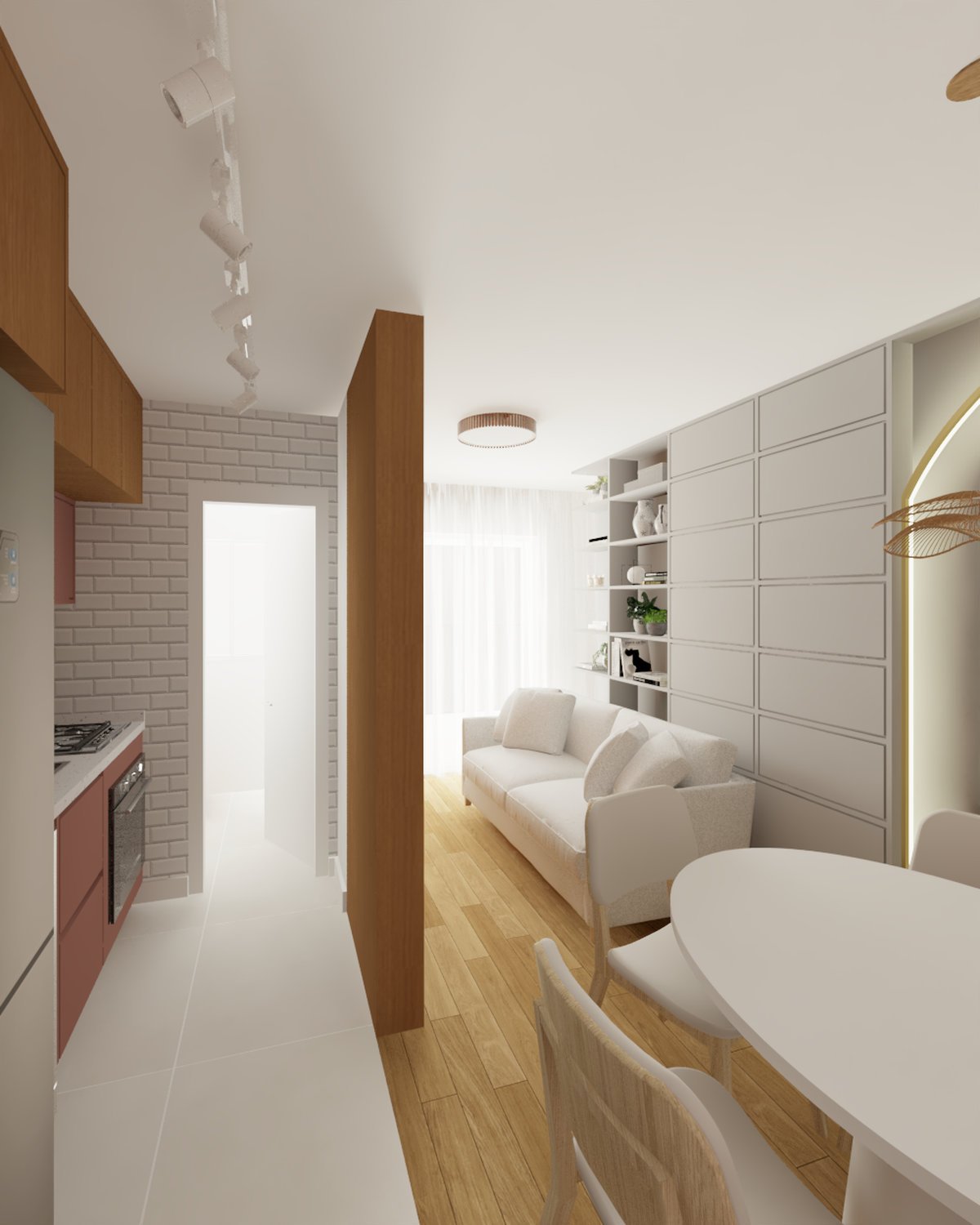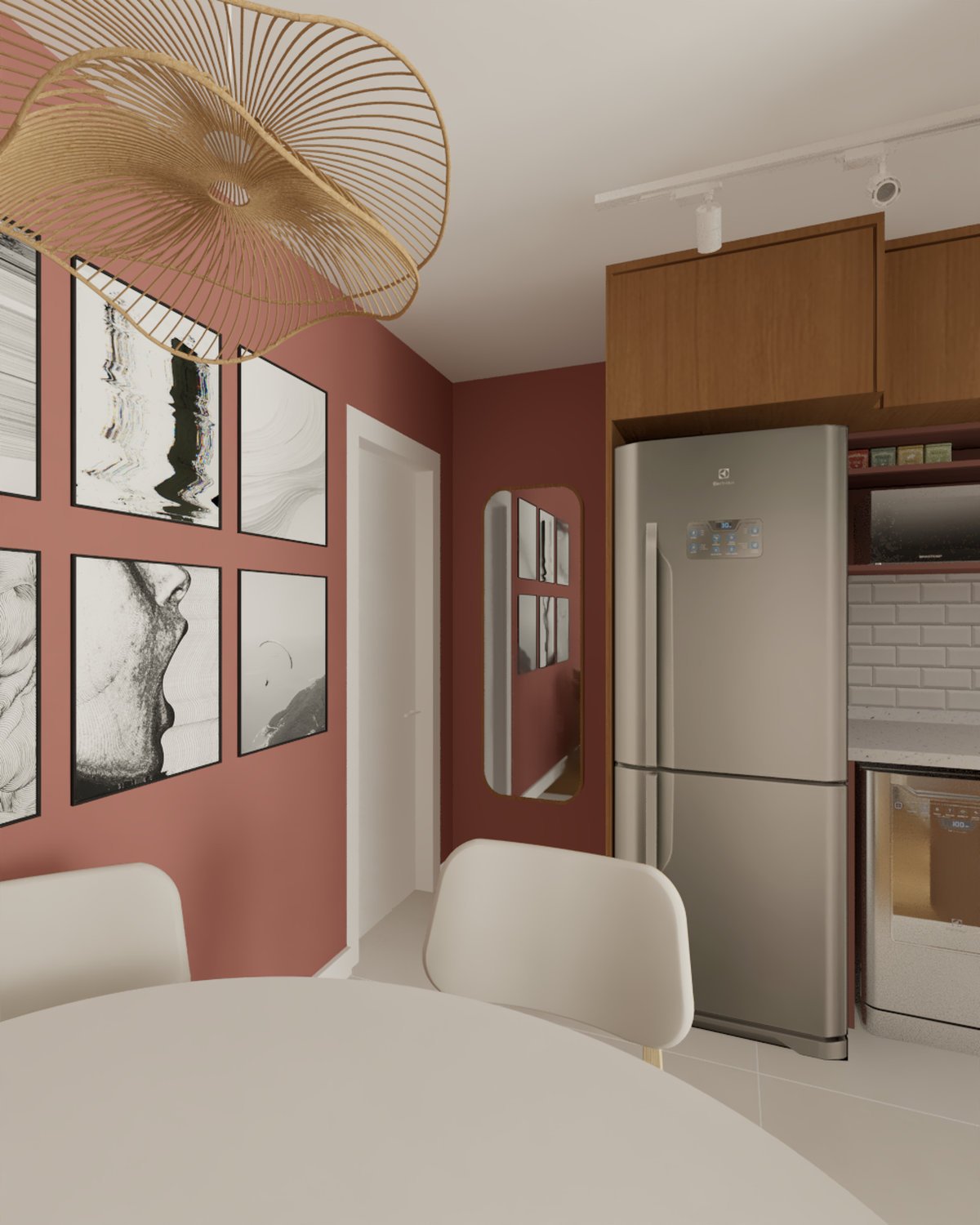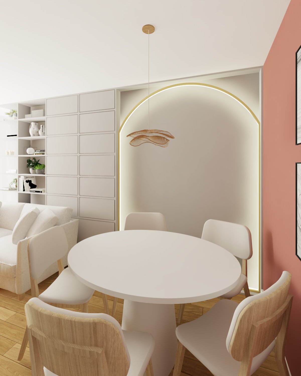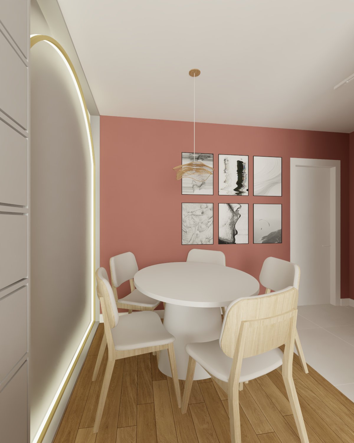 Como ponto de partida, o arco foi adotado como elemento central do projeto, junto à paleta em cinza e dourado, presentes na inspiração original. Para equilibrar e trazer leveza ao espaço, foram adicionados tons de branco, madeira natural e um rosa delicado, que imprime personalidade e delicadeza ao ambiente.