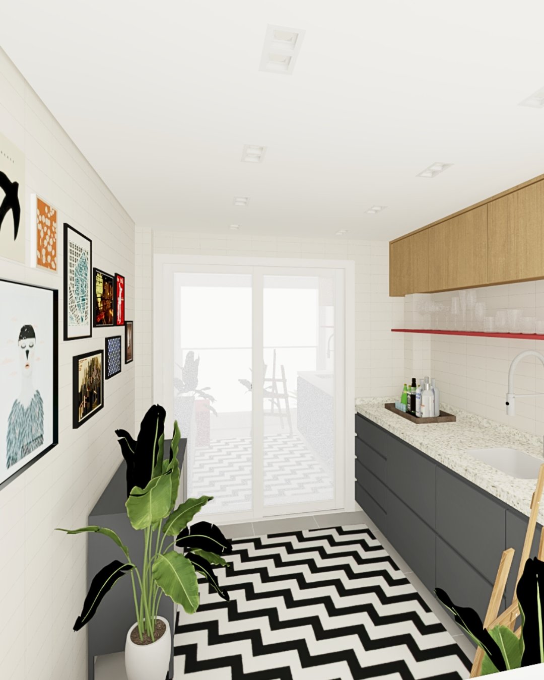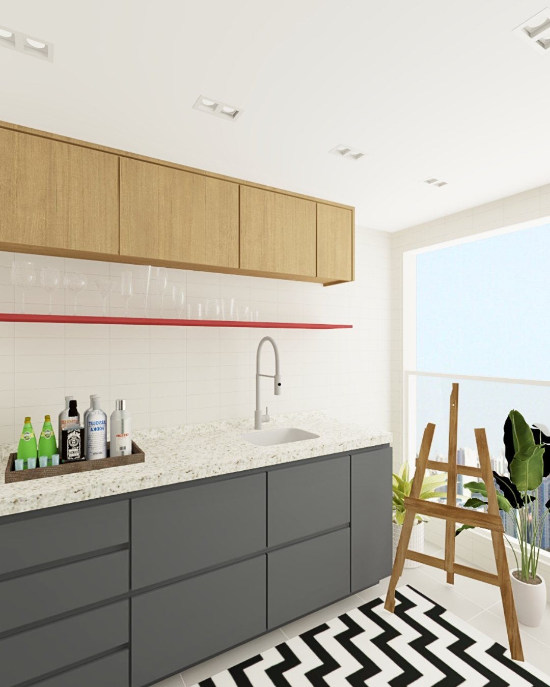Como elemento inusitado, a prateleira vermelha percorre a parede como um traço de cor, quebrando a neutralidade do espaço e funcionando tanto como apoio quanto como elemento de destaque do projeto. O tapete com desenho gráfico reforça essa intenção, adicionando personalidade e ritmo ao ambiente, sem comprometer sua leveza.